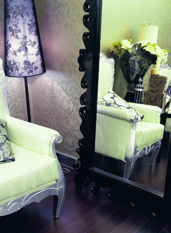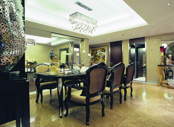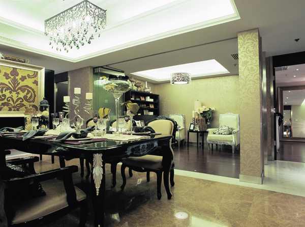 在設(shè)計上,墻面大面積的使用了古典歐式色彩的壁紙配合經(jīng)過提煉的歐式線條,使歐式不再是遙遠(yuǎn)的過去,而是鮮活時尚的品味象征。減掉了復(fù)雜的歐式護墻板使用了提煉過的石膏線勾勒出線框,把護墻板的形式簡化到極致。